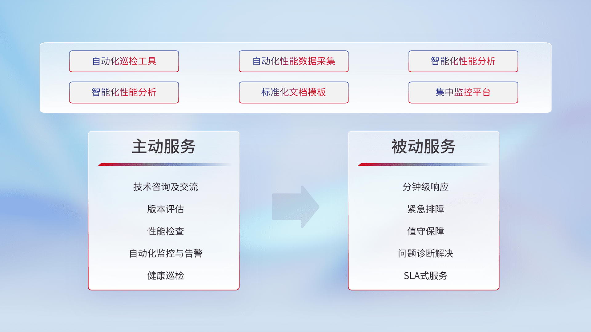 智能化工具和标准化文档,,,保障服务质量,,提供主动服务(包含技术咨询、、、版本评估、、、、性能检查、、自动化监控与告警、、健康巡检)和被动服务包含(分钟级响应、、、、紧急排障、、、值守保障、、、、问题诊断解决、、、SLA服务)。。。。
