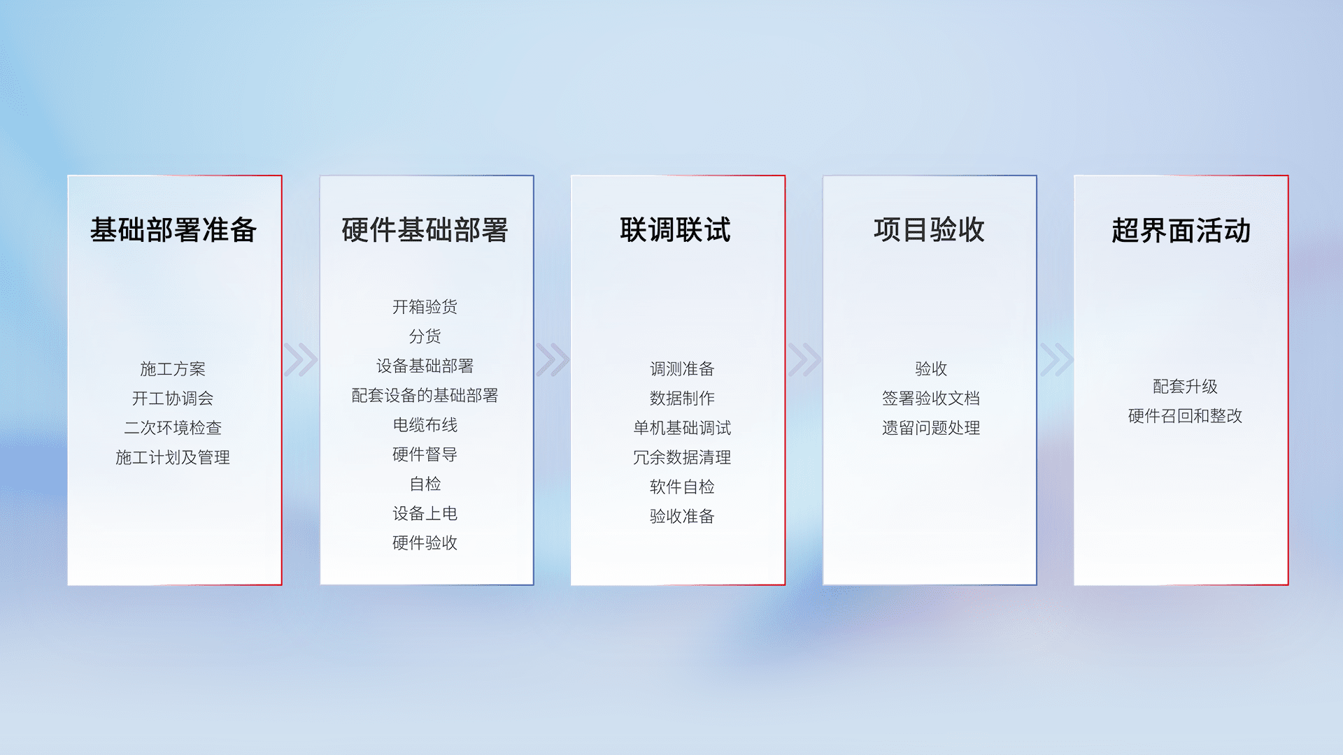 从基础部署准备、、硬件基础部署、、、联调联试、、、、项目验收、、越界面活动的全过程可追溯,,,,保证施工质量和进度。。。。